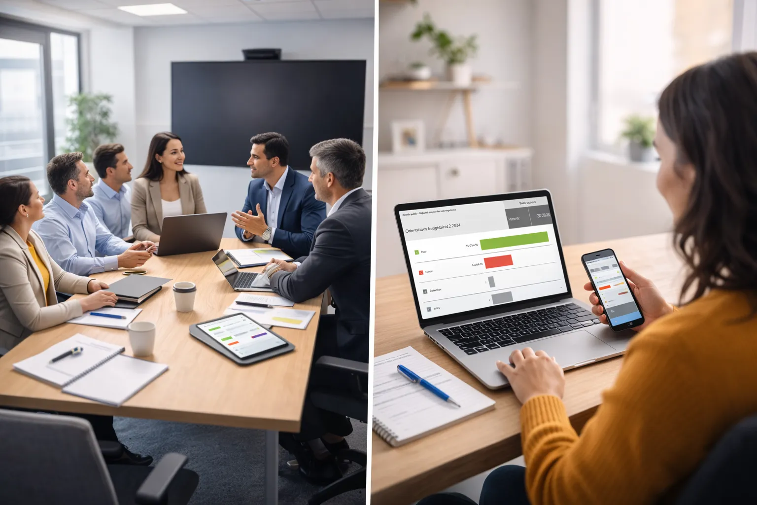 Réunion en présentiel et vote à distance sur ordinateur illustrant le vote synchrone vs vote asynchrone